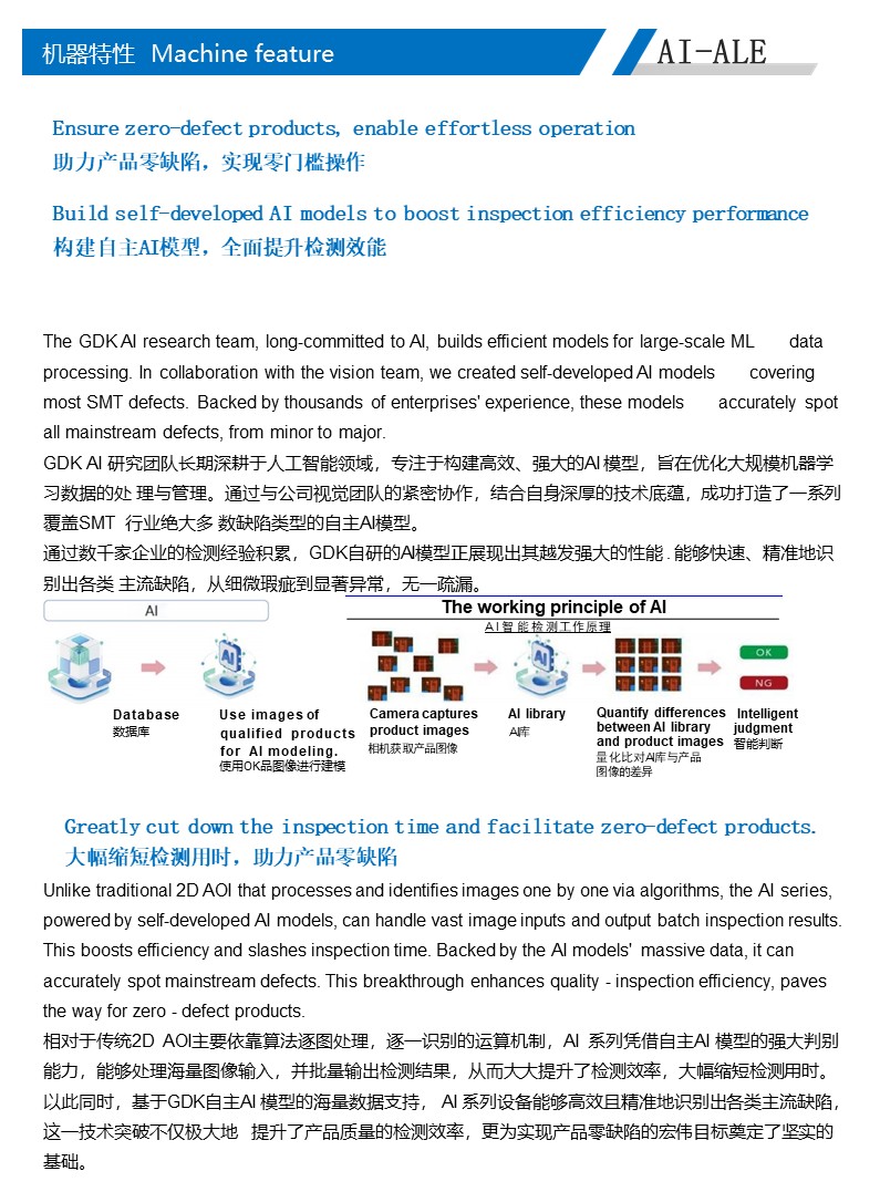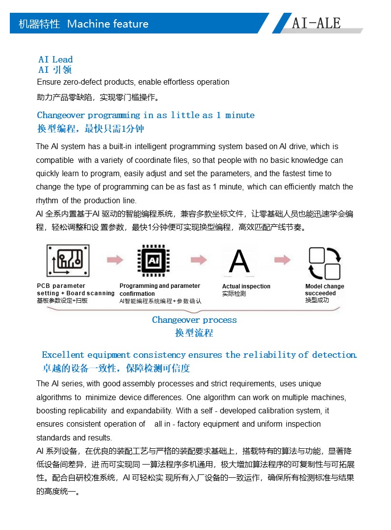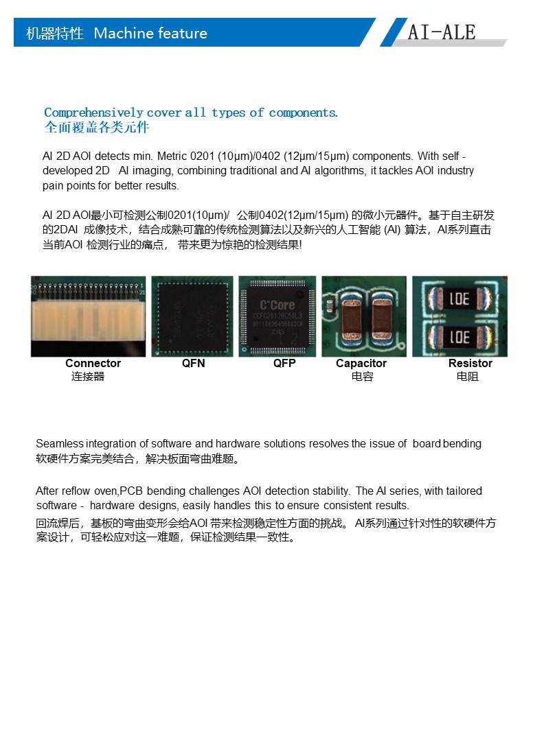 高精度:多重软件分析法,多种应用模式,高精度运动系统; 高效率:一台维修工作站确认多台在线机的检测数据,实现全自动化制程管控;